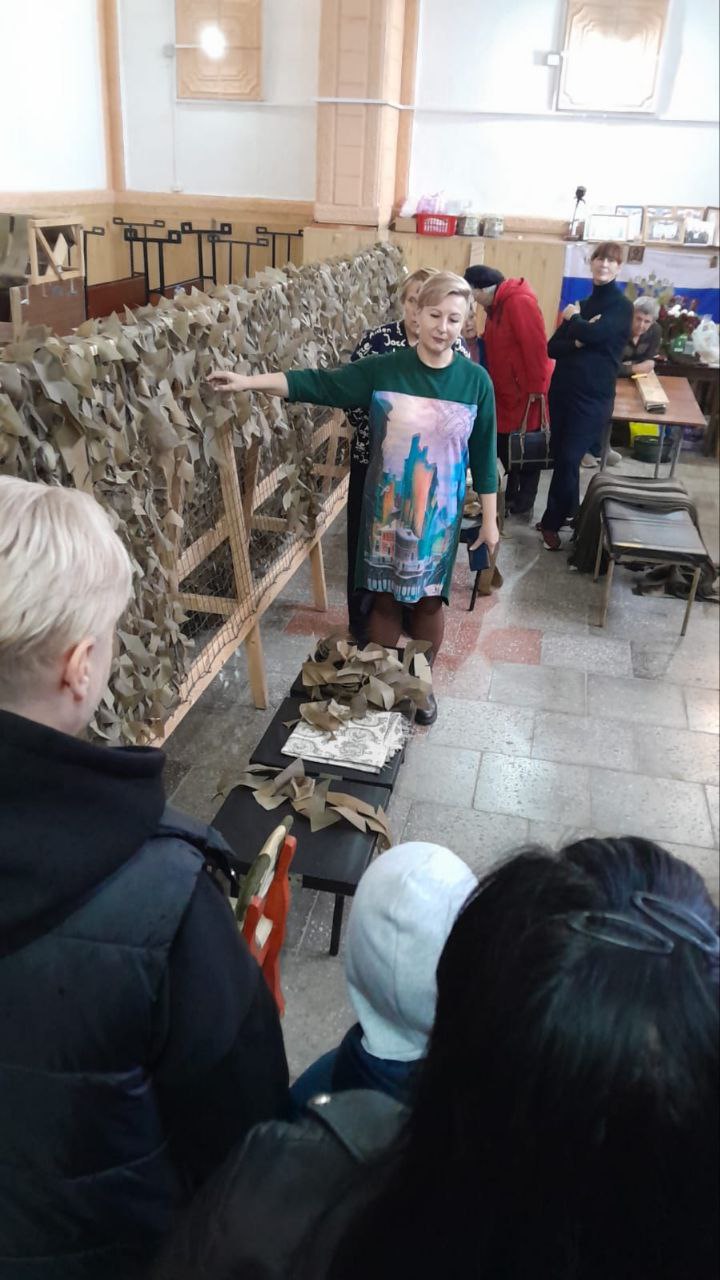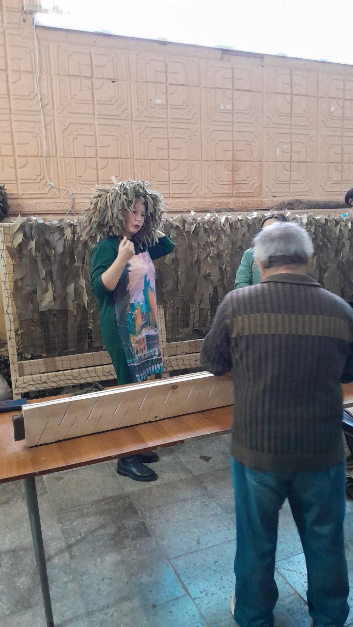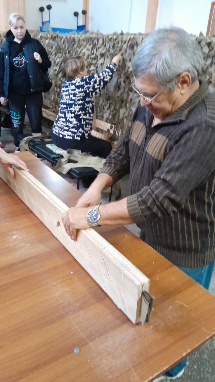 Руководитель группы Елена Александровна Зотова рассказала в подробностях только о части работы, которую они проводят, участники продемонстрировали не только то, что уже готово к передаче, но и весь процесс подготовки и изготовления маскировочных сетей – от нарезки спанбонда на ленты, ленты на «серпантин» и еже из него в основу вплетается маскировка.