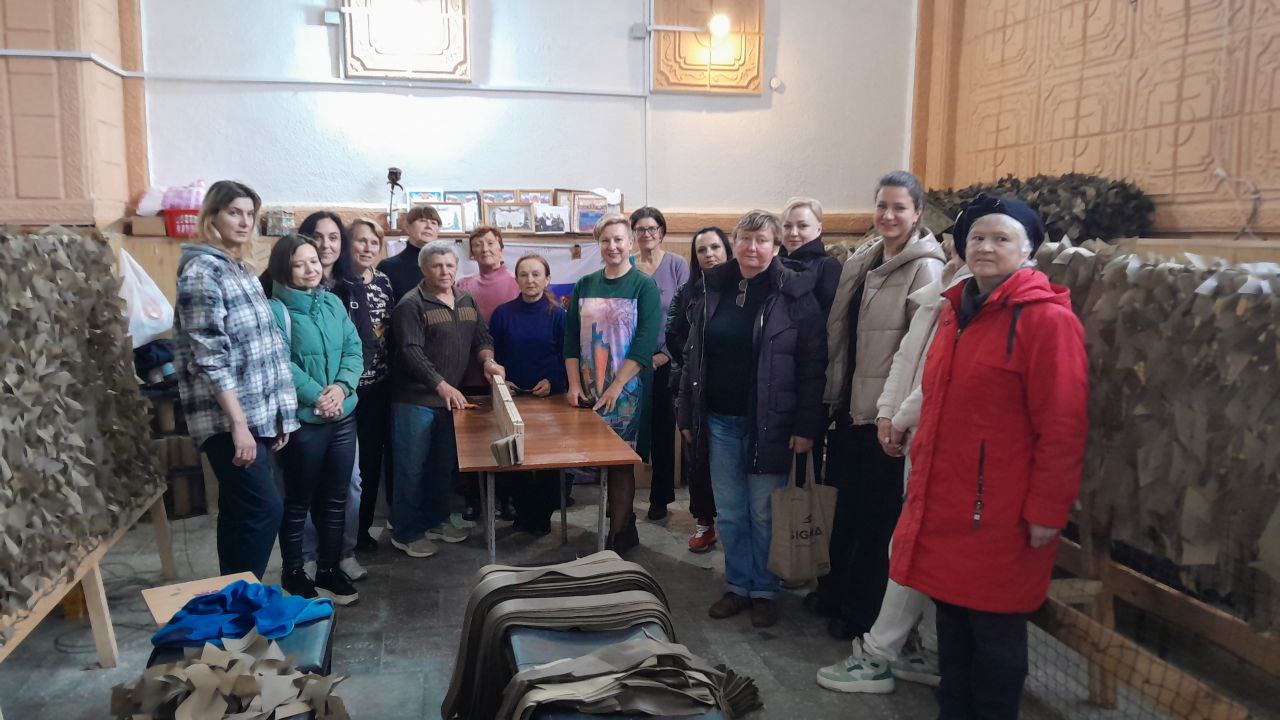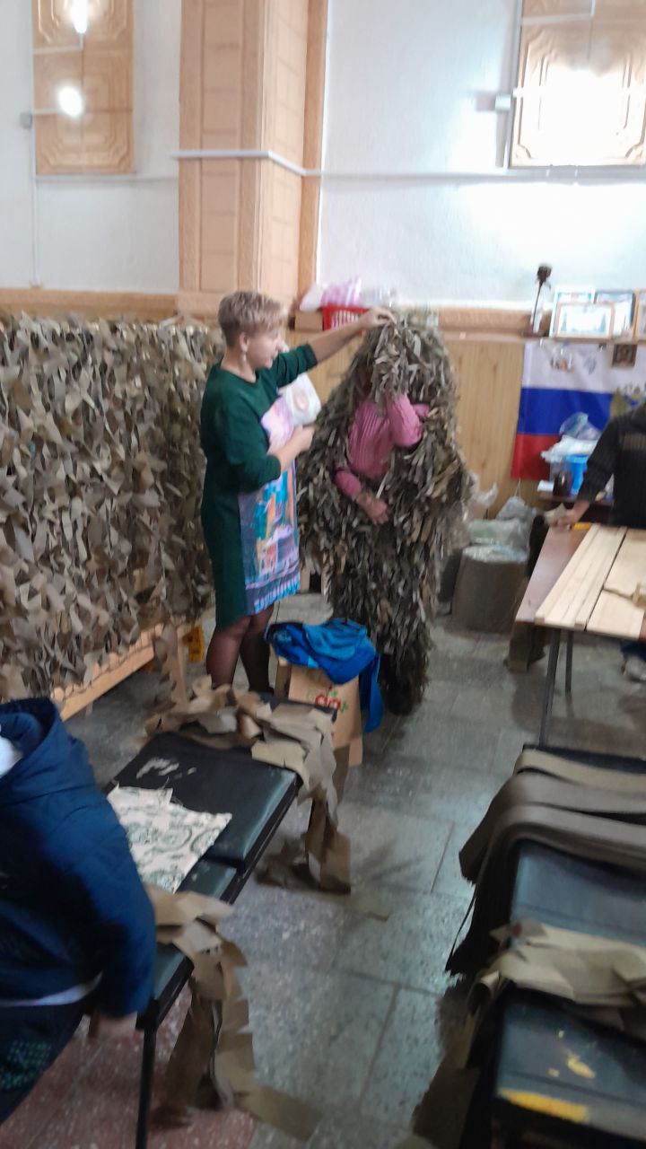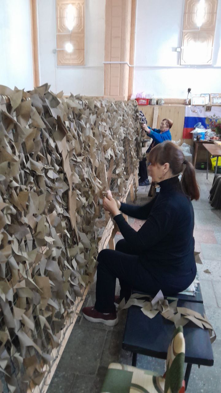 Значимой частью заседания стало посещение волонтерской группы «Родина». Участники этого сообщества неравнодушные люди с добрыми сердцами и золотыми руками, которые в меру своих сил, возможностей и высокого чувства патриотизма, помогают нашим бойцам. Группа плетет маскировочные сети, маскхалаты, как называют их - наряд «Лешего», маскировочные нашлемники, изготавливает окопные свечи, формируют продуктовые наборы для передачи за ленточку и многое-многое другое.