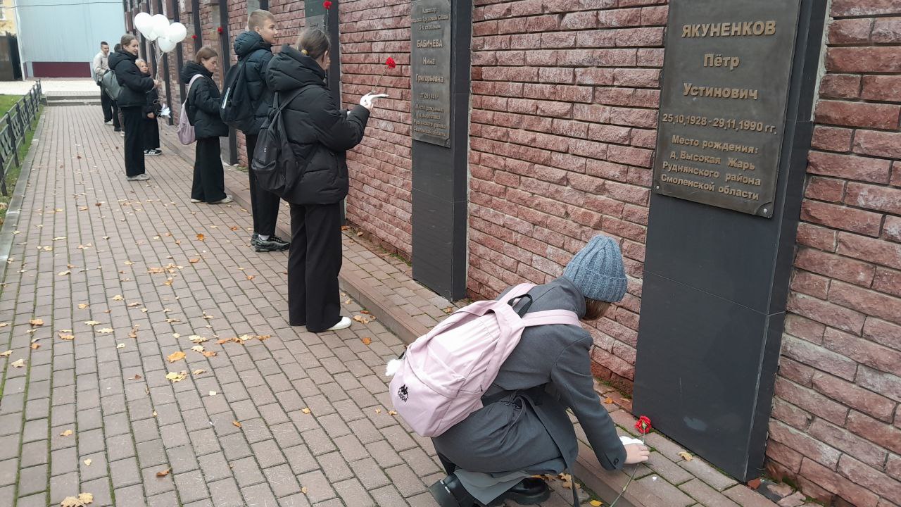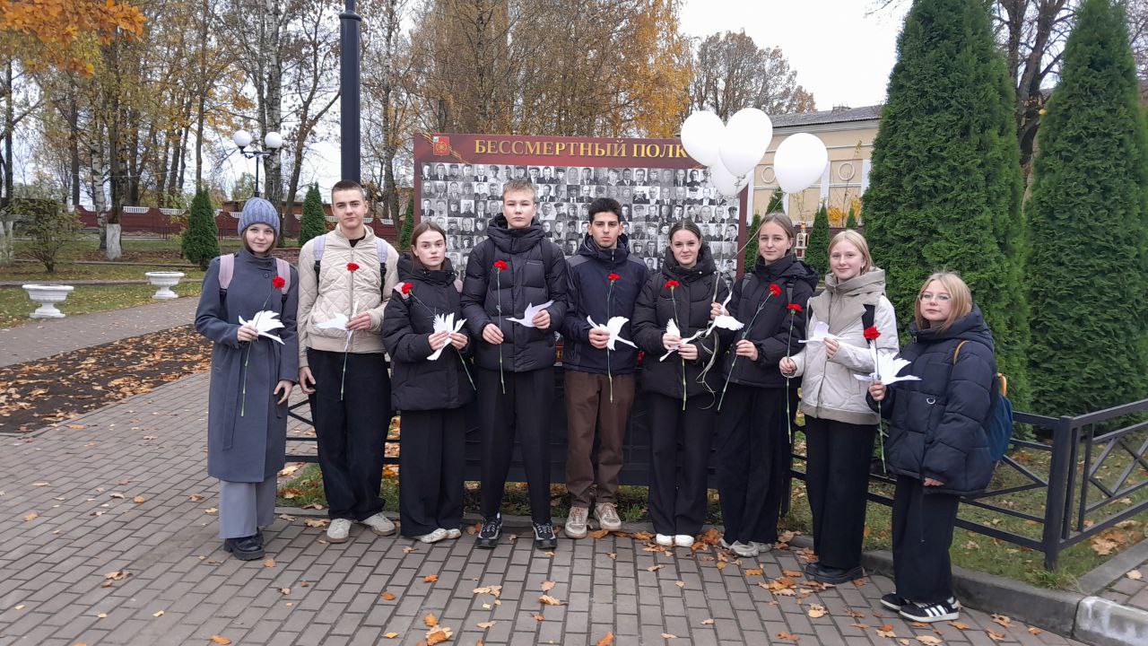 Участники заседания собственноручно вырезали белых журавлей. Фигурки птиц и цветы возложили в сквере героев у барельефов героев Руднянской земли на стене памяти.
