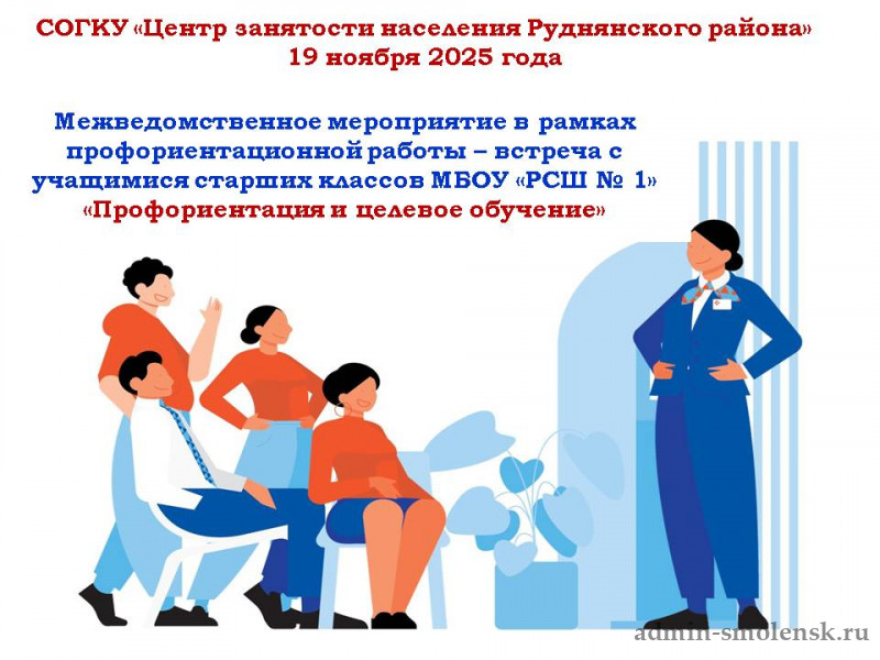 В рамках межведомственных мероприятий по профессиональной ориентации учащихся школ города и района проведена встреча представителями СОГКУ «Центр занятости населения Руднянского района» и МО МВД России «Руднянский» с учащимися МБОУ «РСШ № 1». Участниками встречи стали 19 учащихся старших классов.