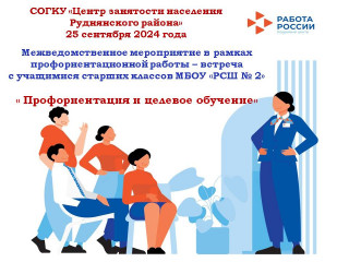 В рамках межведомственных мероприятий по профессиональной ориентации учащихся школ города и района 25 сентября проведена встреча представителями СОГКУ «Центр занятости населения Руднянского района» и ОГБУЗ «Руднянская ЦРБ» с учащимися МБОУ «РСШ № 2». Участниками встречи стали 124 учащихся старших классов.