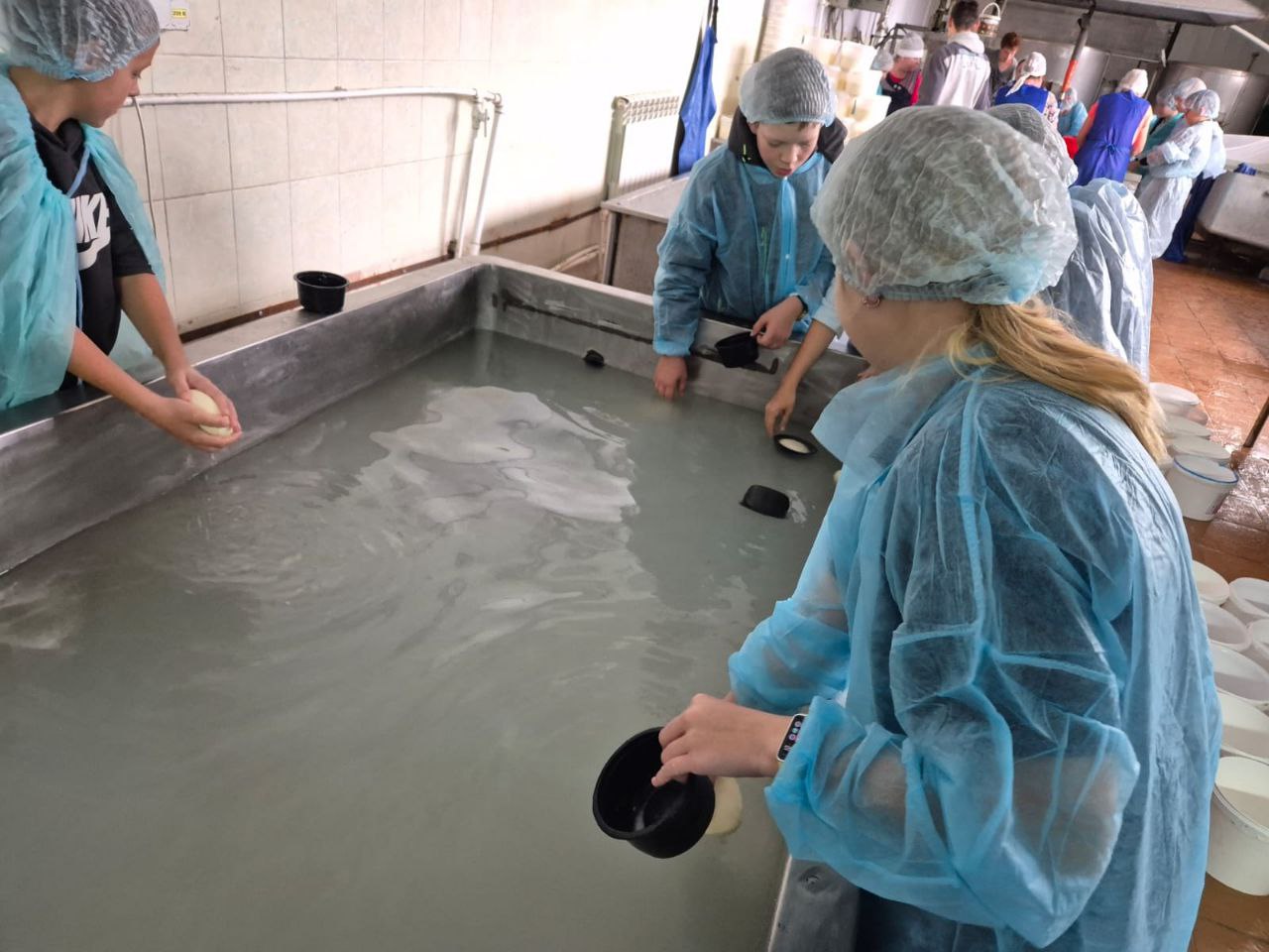 Для ребят был проведен короткий мастер-класс– они попробовали формовать сырную головку, посмотрели как заквашивают сырную массу.