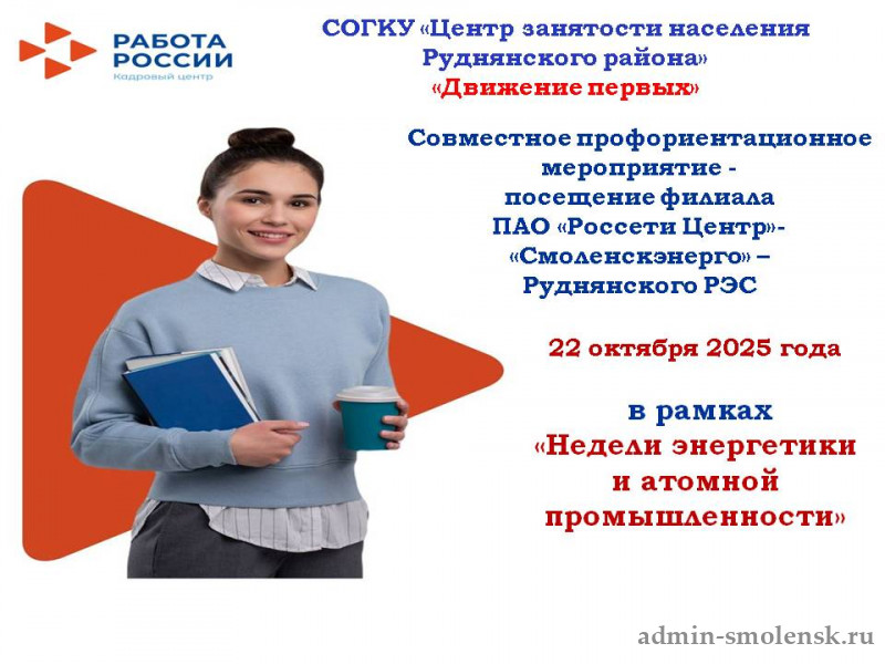 В рамках мероприятий «Недели энергетики атомной промышленности» «Движения первых» 22 октября СОГКУ «Центр занятости населения Руднянского района» организовал совместное профориентационное мероприятие для учащихся старших классов МБОУ «РСШ №1» - посещение филиала ПАО «Россети Центр» — «Смоленскэнерго» - Руднянского РЭС.