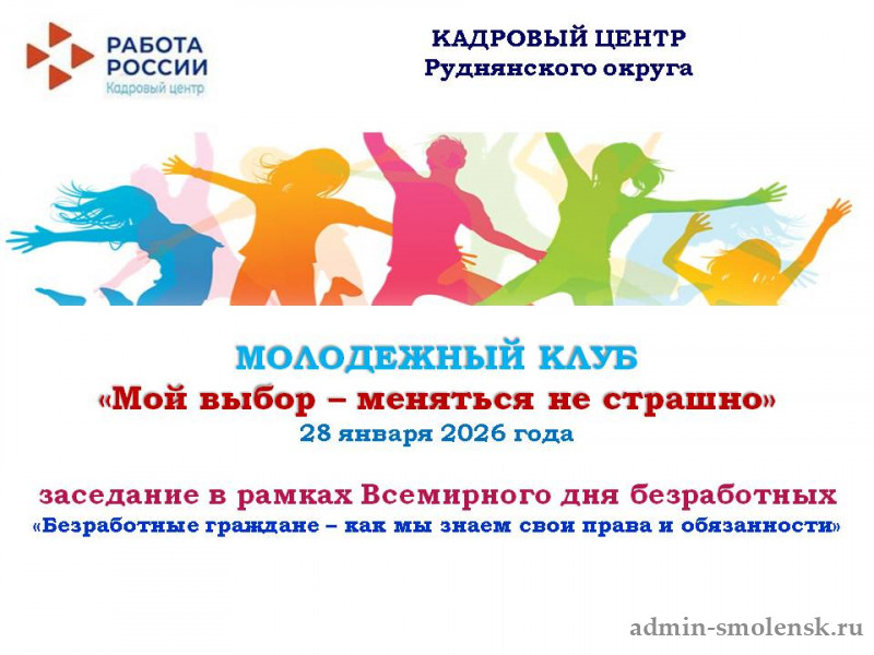 В рамках Всемирного дня безработных, молодежный клуб при Кадровом центре Руднянского округа «Мой выбор – меняться не страшно» распахнул свои двери для молодых людей, стремящихся разобраться в сложном, но важном вопросе - правах и обязанностях безработного гражданина. Тема, безусловно, актуальна в современных экономических условиях, где поиск работы – это порой настоящее испытание.