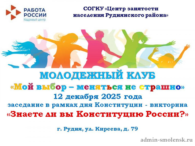 В этот знаменательный для каждого гражданина нашей страны день СОГКУ «Центра занятости населения Руднянского района» организовал заседание Молодежного клуба «Мой выбор- меняться не страшно» для безработных граждан в возрасте до 35 лет на тему «Знаете ли вы Конституцию России?».